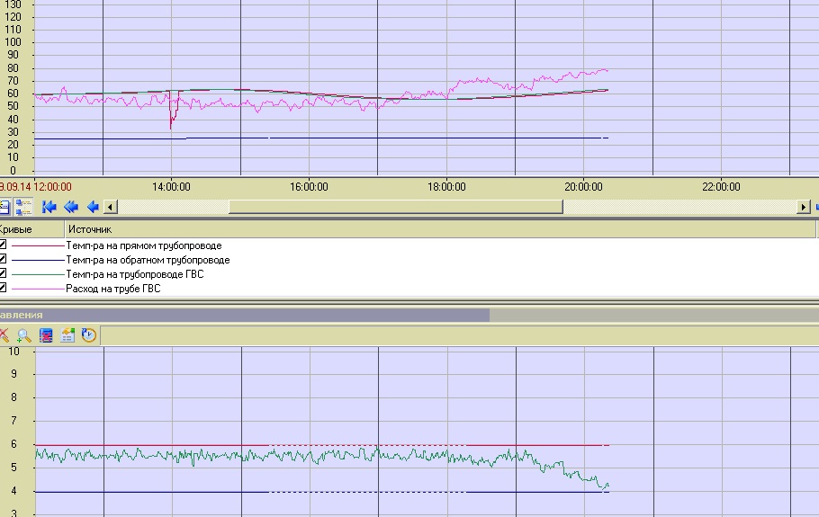 розовым - расход (макс точка -64 т\ч - верх "пилы зубов"= 30 т\ч , зелёный - давление - синяя метка 5 атм.)
