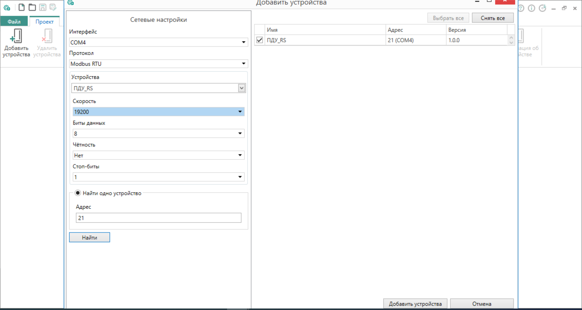 Используя протокол Modbus RTU и известный адрес, датчик определяется.