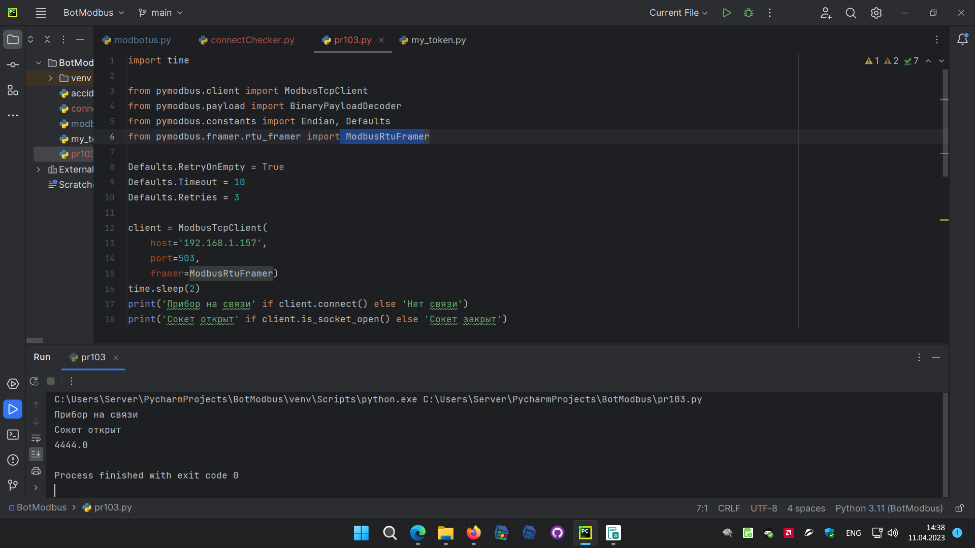 Вам надо использовать режим Modbus RTU over TCP в python скрипте. Модули usr-tcp232-304 не производят конвертацию Modbus RTU в Modbus TCP.