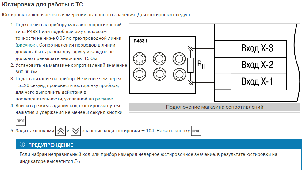 Добрый день уважаемые колеги.Встал вопрос калибровки прибора из за того что он не верно показывает температуру от датчика температуры Pt-100 если сопротивление на самом датчики 108,5Ом то темп должна быть 21,8 град а мне прибор показывает 17,8 потом на самих клемах прибора куда подключен датчик темп ДТС 035 тоже такое же сопротивление как и на самом датчике.Пробовал войти в режим Юстировки прибор мне пишет ошибку.Значить взял последовательно соединил 5 резисторов по 100Ом погрешность резисторов -+0,25 подключаю к прибору выбираю код 104 и прибор пишет ошибка.Хотя когда подключаю 100Ом на вход прибор показывает 0,0 град.Я так понимаю с прибором проблема в сервис его вести?Сами датчики температур новые были куплены в том году.