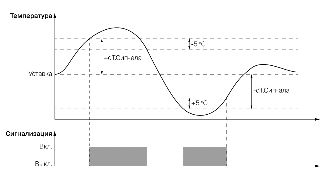 Для срабатывания сигнализации необходимо, чтобы температура контура превысила значение перегрева или опустилась ниже значения недогрева. Значение перегрева соответствует: Уставка + dT.Сигнал, а недогрева: Уставка – dT.Сигнал. Если значение dT.Сигнал установлено равным 0, функция сигнализации отключается.