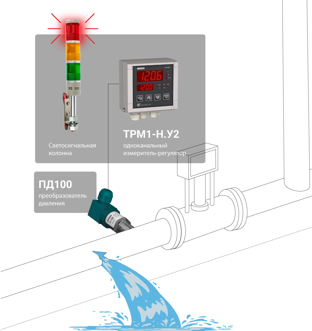 Благодаря внедрению регулятора ТРМ1 и датчика ПД100 при снижении давления ниже критического насос будет незамедлительно остановлен, и не выйдет из строя. В качестве дополнительных действий необходима врезка датчика давления в точке подключения к трубопроводу через разделитель сред, монтажные работы по установке устройства ТРМ, прокладка линии связи от прибора до датчика и наладка ТРМ. При необходимости ТРМ способен передавать информацию об измеренном значении по цифровому интерфейсу для диспетчеризации.