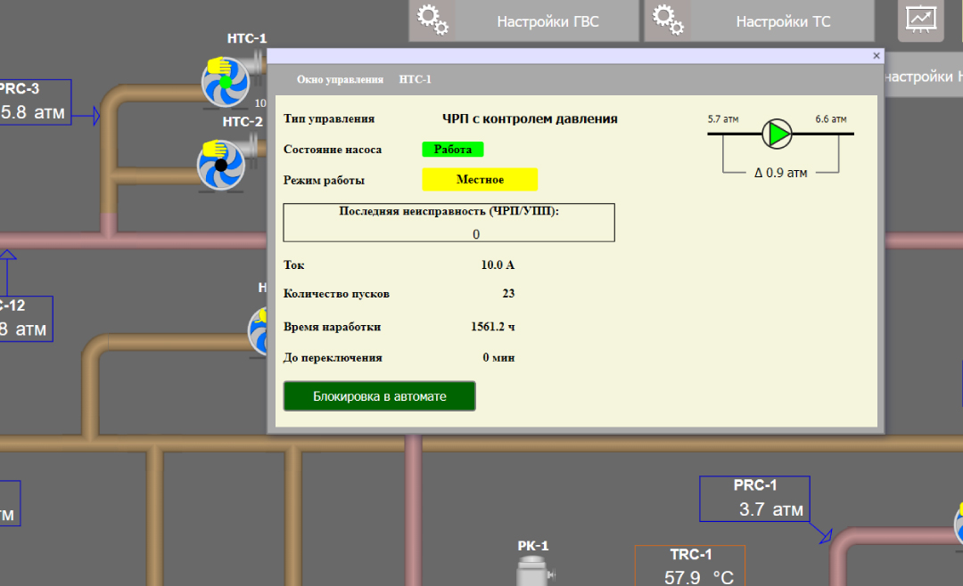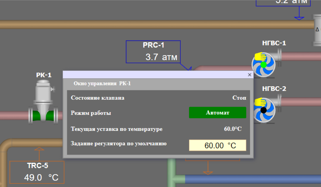 Система управления работает как в ручном, так и в автоматическом режимах. В ручном режиме управление всеми устройствами теплопункта происходит с панели шкафа управления диспетчеризацией. Оператор диспетчерского пункта имеет возможность только отслеживать работу ЦТП.