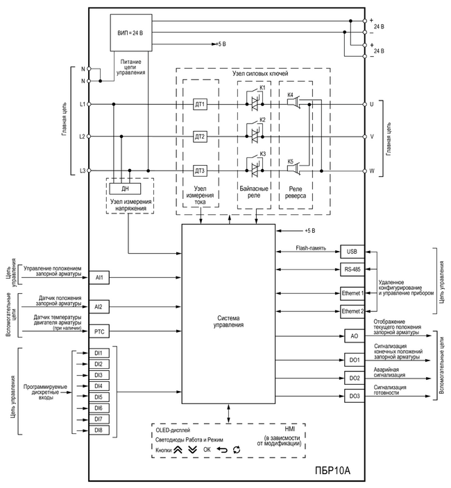 Конструкция бесконтактного реверсивного пускателя предусматривает управления унифицированными сигналами по цифровым и аналоговым входам, а также через интерфейсы RS-485, Ethernet, USB.