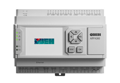 Поскольку ключевым ограничением для данного проекта стало использование отечественного оборудования и автоматики, в качестве главного управляющего устройства был выбран специализированный контроллер для вентиляционных систем ОВЕН АЙРА360. Для увеличения количества входов и выходов использованы два модуля расширения для программируемых реле ОВЕН ПРМ-1 И ПРМ-2. Подключение модулей осуществляется по внутренней шине.