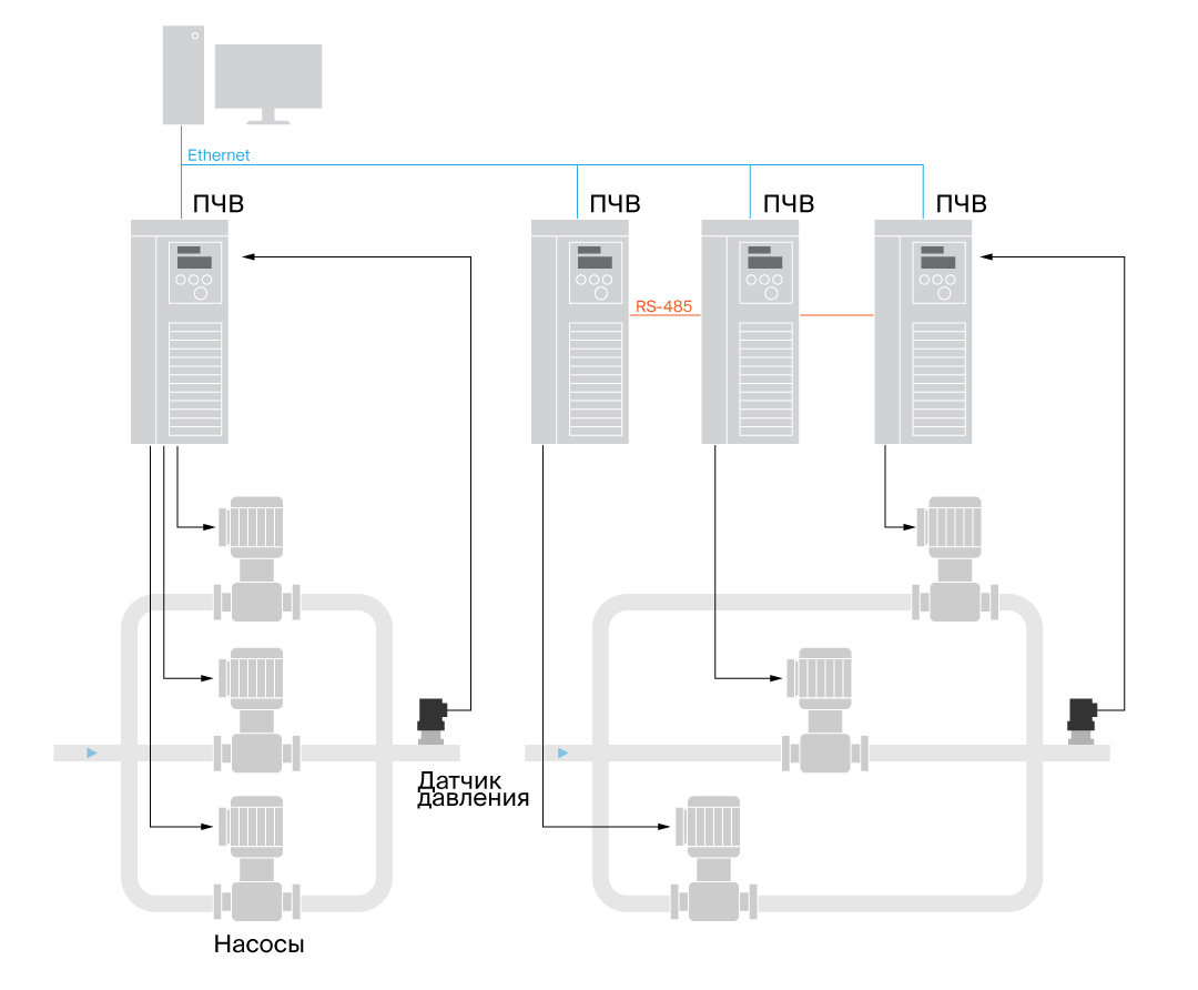 Варианты схем управления: один ПЧ управляет несколькими насосами и каждый ПЧ управляет отдельным насосом
