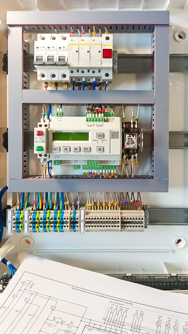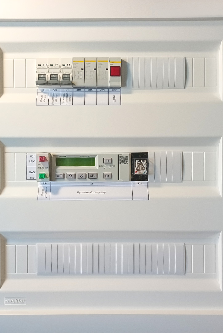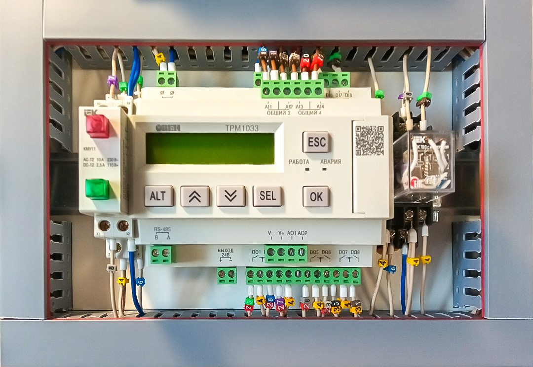 Для погодозависимого управления системой приточной вентиляции без участия человека был собран шкаф управления на базе контроллера ОВЕН ТРМ1033.