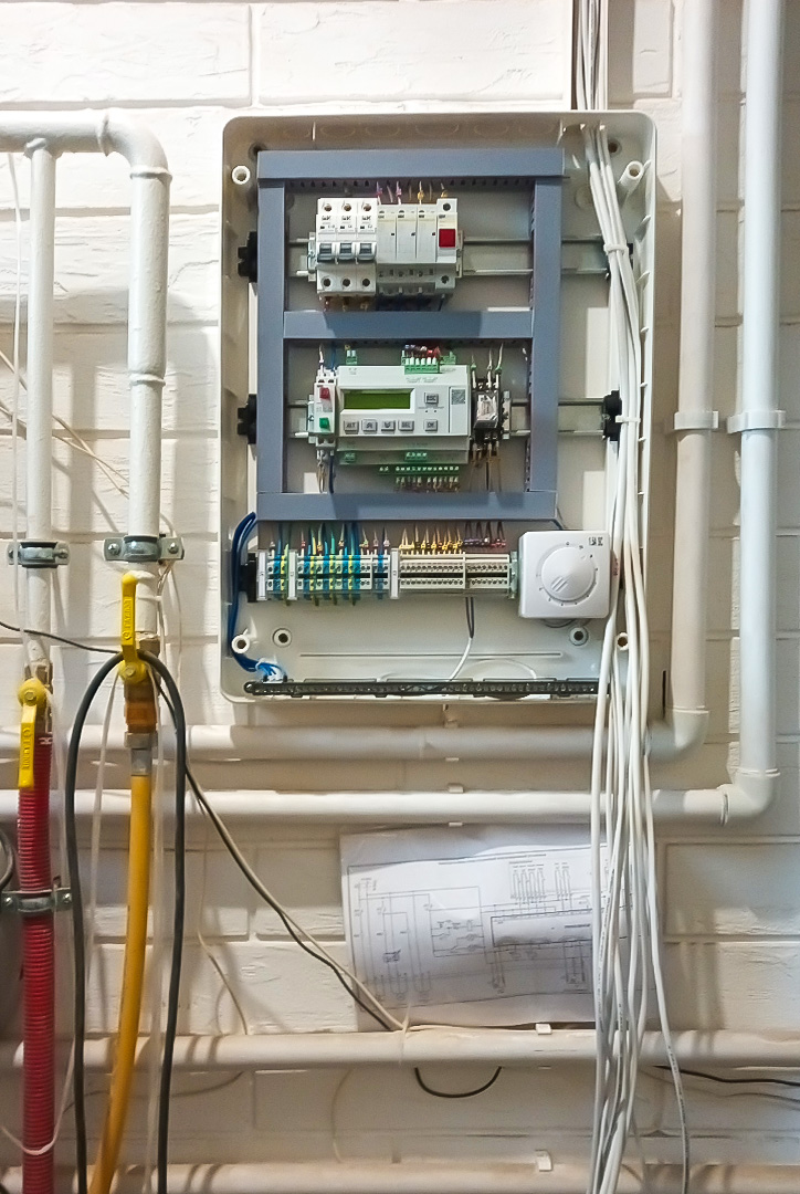 Для этого в доме установили стандартную приточную систему. В ее состав входит однофазный приточный вентилятор для нагнетания воздуха, воздушный клапан для регулировки притока свежего воздуха, фильтр, водяной калорифер для подогрева поступающего уличного воздуха до комфортной температуры, циркуляционный насос в контуре ГВС калорифера, также дискретный КЗР для регулирования температуры непосредственно в калорифере.