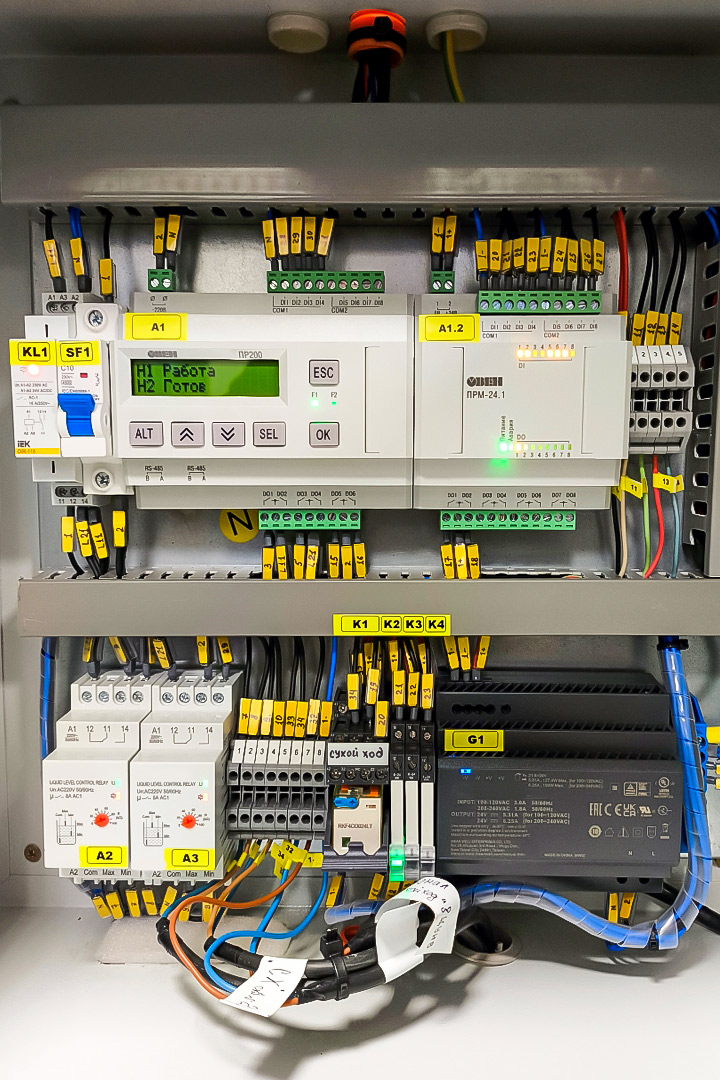 Для глубинных насосов мы разработали два шкафа управления на базе программируемого реле с дисплеем ОВЕН ПР200 и модулями расширения входов-выходов ОВЕН ПРМ. Они контролируют включение, отключение и чередование насосов для наполнения накопительной емкости, а также защиту от сухого хода.
