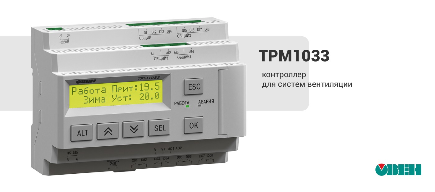 Компания ОВЕН разрабатывает специальные приборы с уже готовыми алгоритмами работы для типовых схем управления вентиляционными установками. Контроллер для управления вентиляцией ТРМ1033 разработан на базе программируемого реле ПР200. Программа управления вентиляцией написана с помощью отечественной среды программирования Owen Logic.