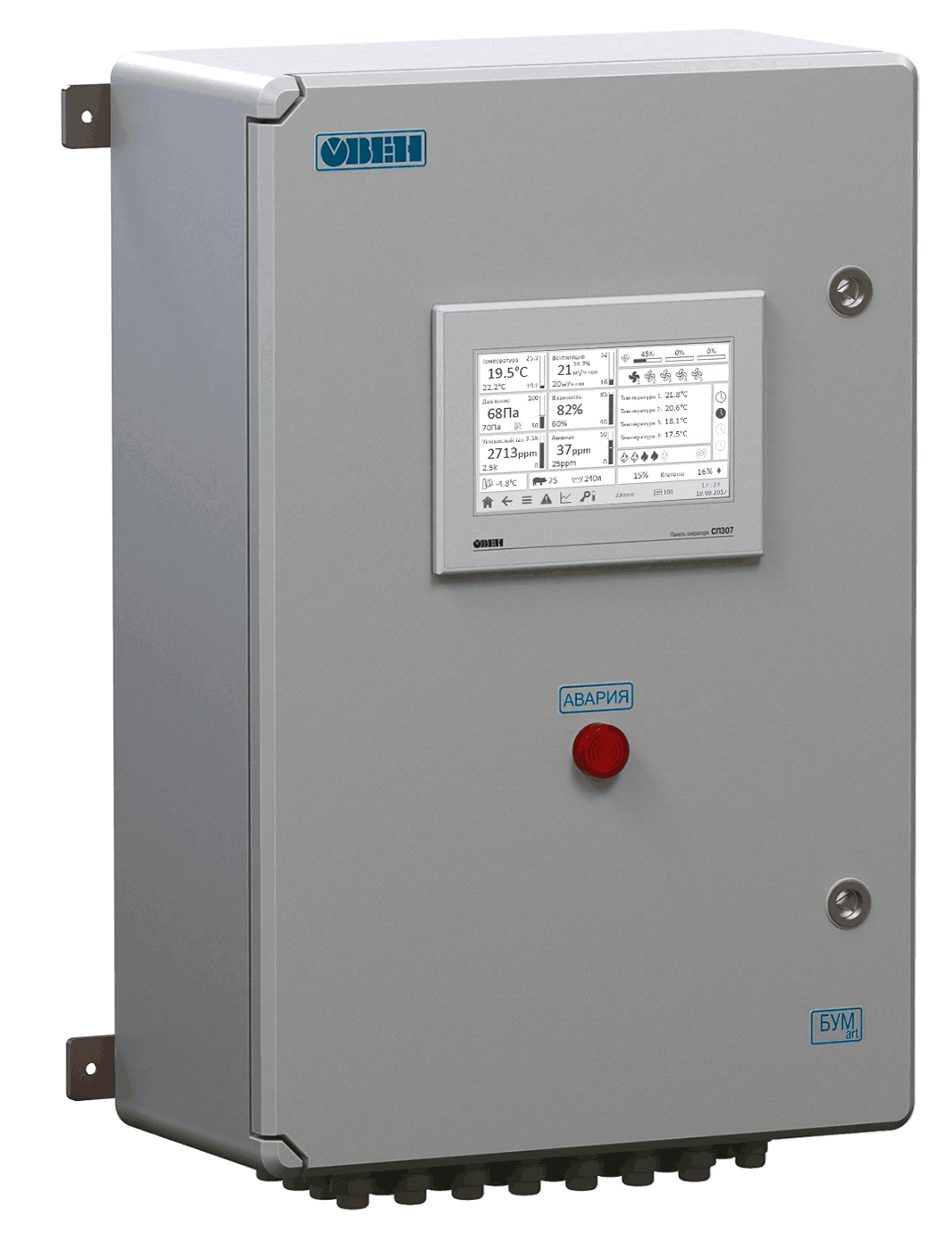 На основе данных от датчиков – температуры, влажности, давления, газа, освещенности – блоки управляют системами вентиляции, обогрева, охлаждения, увлажнения, освещения и т.д. На графическом дисплее отображаются текущие параметры микроклимата для оперативного контроля. При необходимости оператор может изменить заданные настройки.