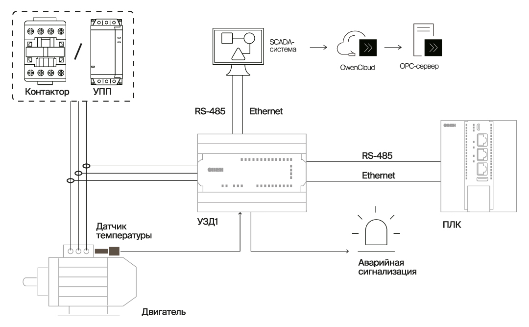 Устройство защиты двигателя ОВЕН УЗД1 – это система защиты и управления двигателем с мгновенным мониторингом всех его параметров. Прибор обеспечивает управление контакторами силовой цепи и комплексную защиту, контроль параметров электродвигателя, ведение журнала событий и передачу информации на верхний уровень АСУТП.