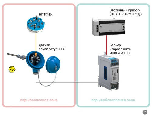 Далее перед вторичным прибором, уже во взрывобезопасной зоне, монтируется барьер. Он ограничивает электрические параметры цепи до искробезопасных значений.