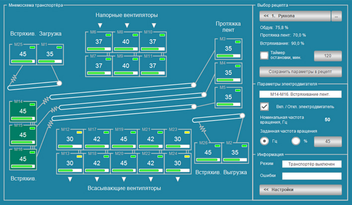 АСУ трехуровневого транспортера для сушки салата обеспечивает эффективное управление процессом на каждом уровне. Каждый из трех уровней имеет одинаковое назначение и дает возможность настройки следующих параметров: