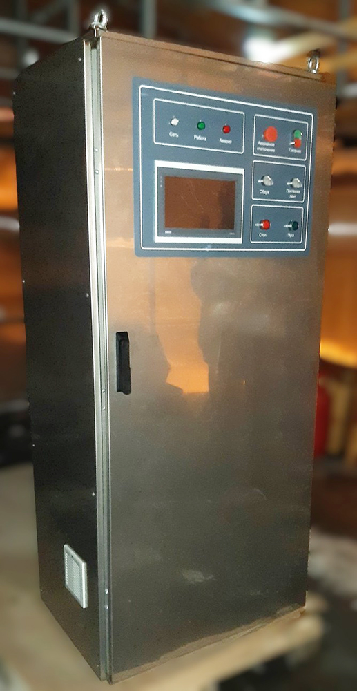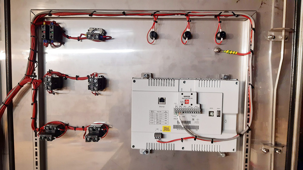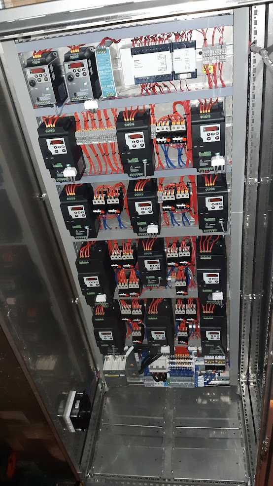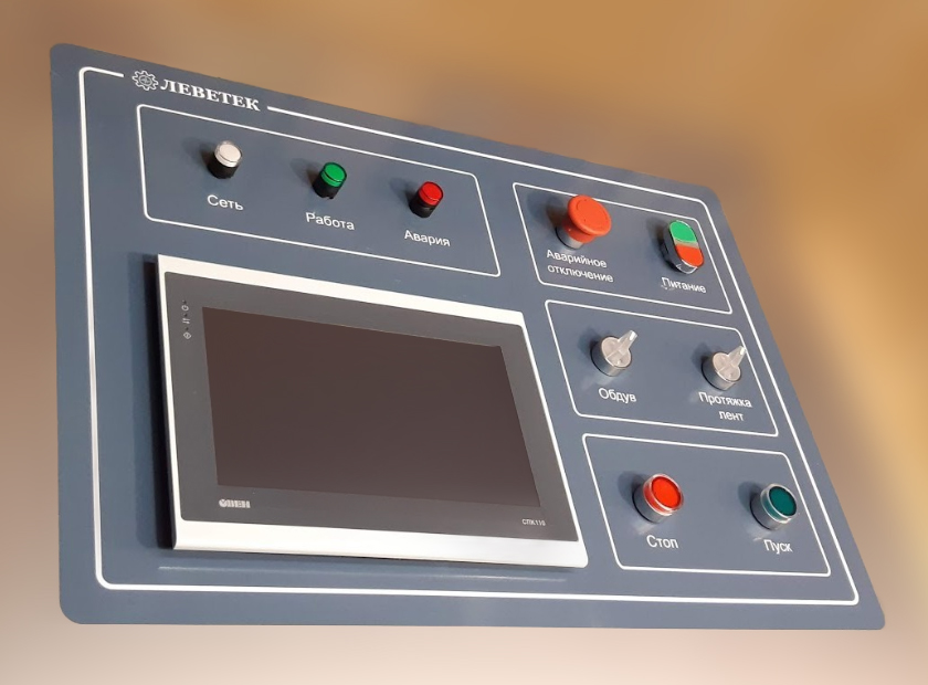 Для успешной реализации проекта по автоматизации процесса сушки «ЛЕВЕТЕК» разработал АСУ (автоматизированную систему управления) на базе сенсорного панельного контроллера ОВЕН СПК110, модуля дискретного ввода МВ110-32ДН, модуля дискретного вывода МУ110-16Р и частотных преобразователей. Для управления и сигнализации на передней панели шкафа установлено электротехническое оборудование MEYERTEC: лампы, кнопки, переключатели.