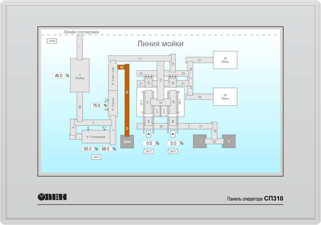 При реализации проекта компания "Комплексная автоматизация" в качестве основного оборудования выбрала ПЛК110 и модули расширения. Для отображения и возможности управления линией мойки овощей партнер применил сенсорную панель оператора СП310.