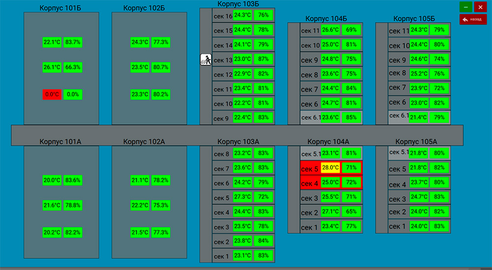 - мониторинг работы оборудования с регистрацией аварий, сбоев и параметров работы (двигатели, насосы, вентиляторы и др.) и оповещением об аварийных ситуациях по SMS и в Telegram;