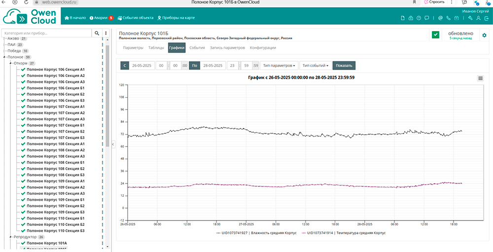 - архивирование данных в облачное хранилище OwenCloud для удаленного доступа, аналитики и построения отчетов.
