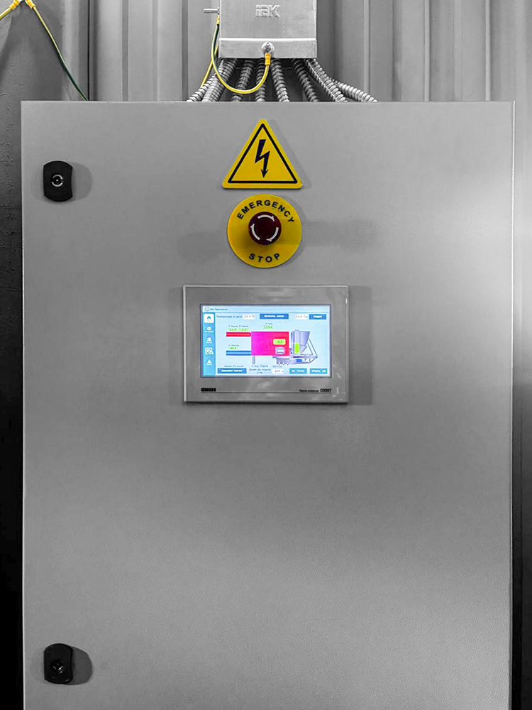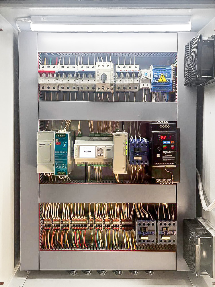 За каждый технологический узел отвечает отдельный шкаф автоматики. Щиты управления котлами разработаны на базе ПР205, щиты управления насосами и дымососами на базе ПР225. Управление всем оборудованием осуществляется на основе данных, получаемых с датчиков через модули ввода линейки ОВЕН МВ210.
