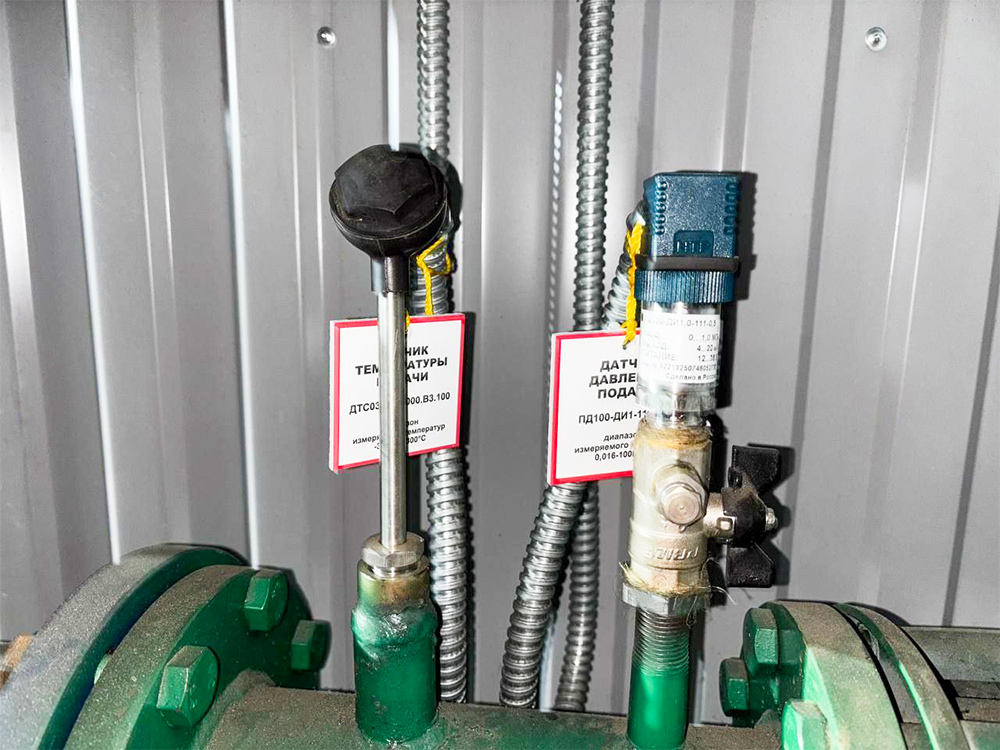 Контроль температуры подачи в трубопроводе осуществляется с помощью датчиков ОВЕН ДТС035, контроль давления подачи – с использованием преобразователей избыточного давления ОВЕН ПД100-ДИ-111.