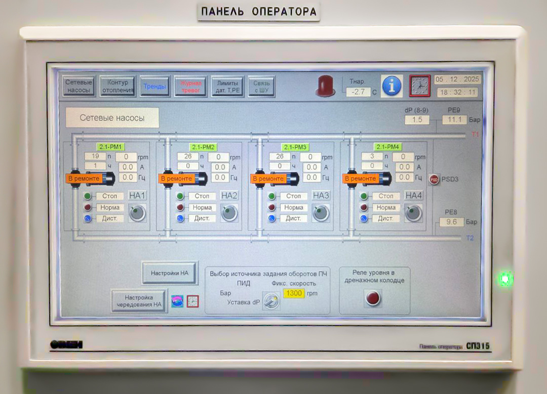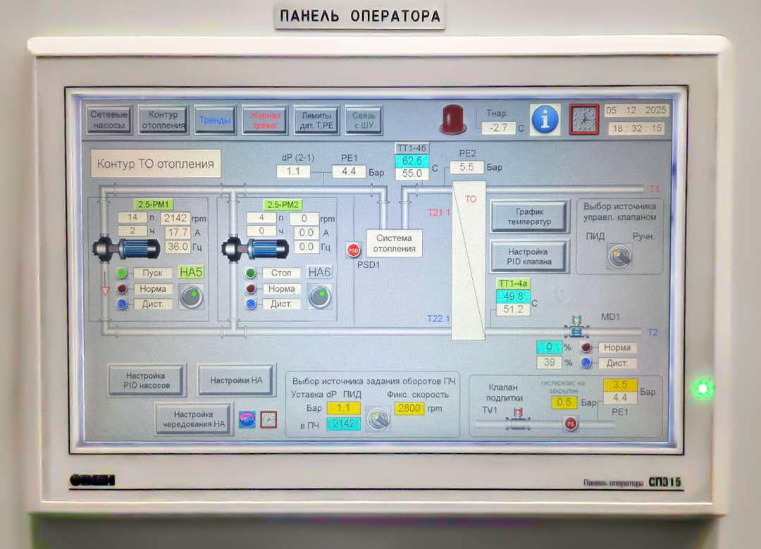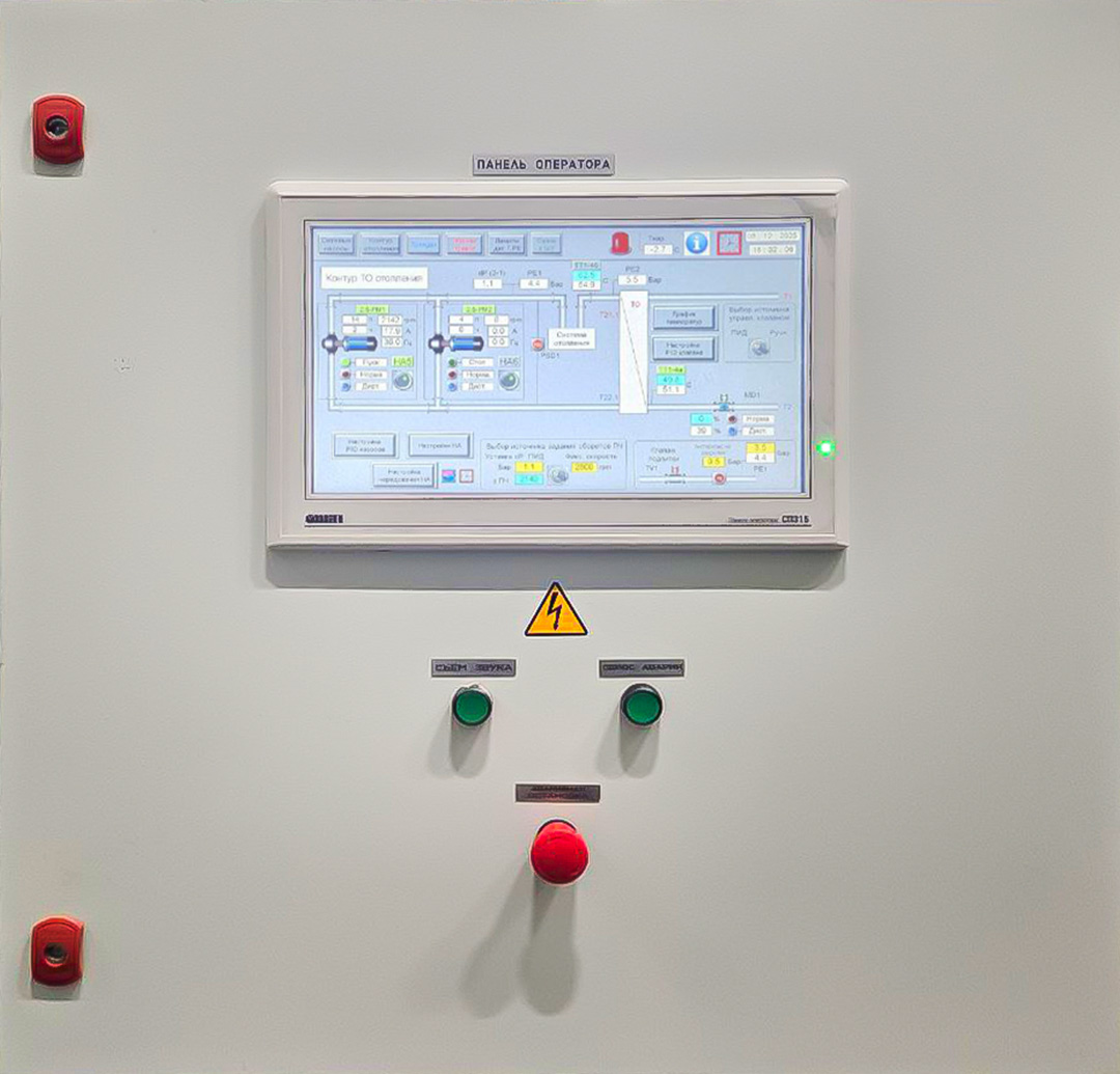 Для визуализации параметров работы системы используется панель оператора СП315, на которой отображается состояние работы оборудования (насосов, клапанов, температура, давление и др.), можно просматривать историю отображаемой информации, осуществляется запись аварийных состояний.