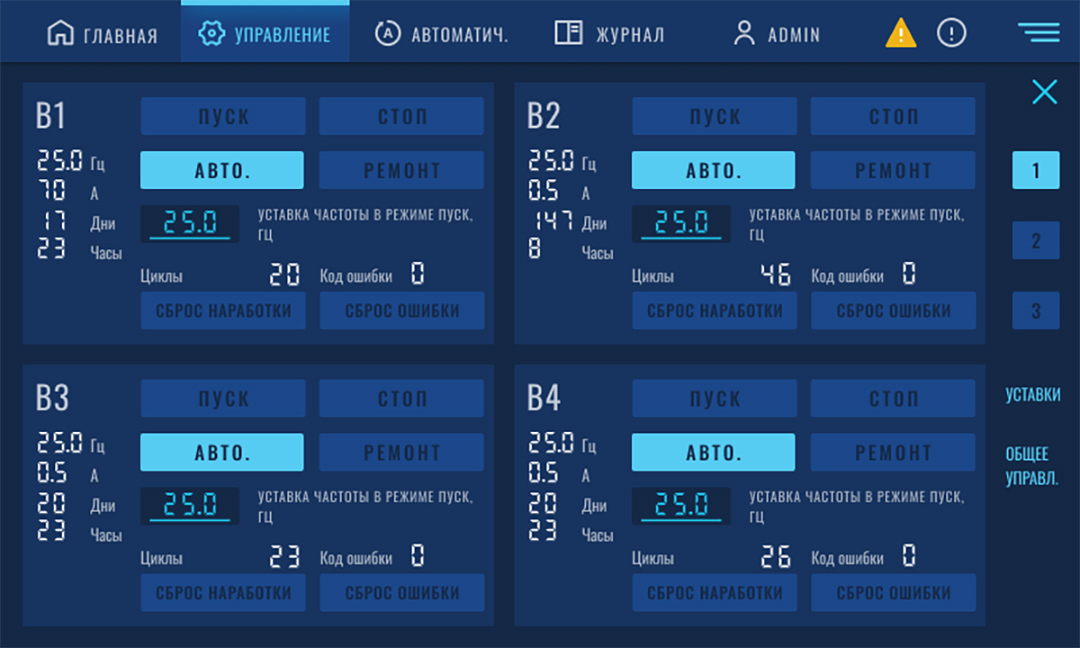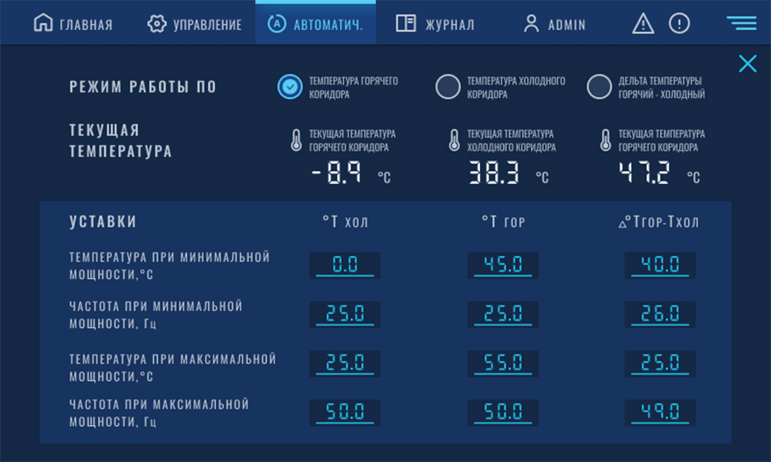 Удаленный мониторинг системы охлаждения реализован с помощью облачного сервиса диспетчеризации OwenCloud. На мнемосхемах отображаются параметры состояния вентиляторов горячих и холодных коридоров, режимы работы и уставки. Управление может осуществляться локально или дистанционно, оператору доступны в том числе архивные данные: показания датчиков температуры, статусы работы и параметры электродвигателей.