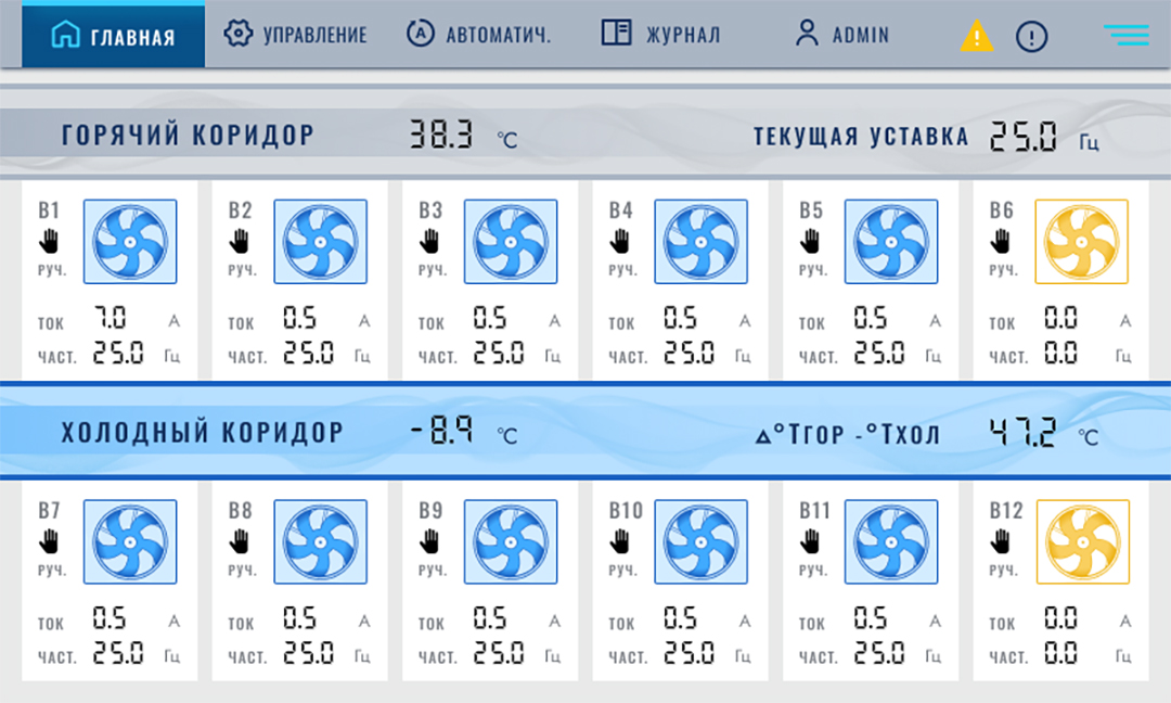 В системе охлаждения ЦОДа предусмотрено по шесть вентиляторов для горячего и холодного коридоров. Для управления каждым вентилятором вместо контактора был установлен частотный преобразователь ОВЕН ПЧВЗ.  Это обеспечило прецизионное регулирование температуры за счёт плавного изменения скорости вращения в зависимости от реальной потребности в охлаждении, а также позволило снизить энергопотребление, уровень шума и исключить вредные для оборудования температурные колебания.