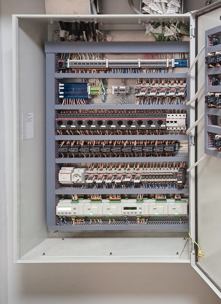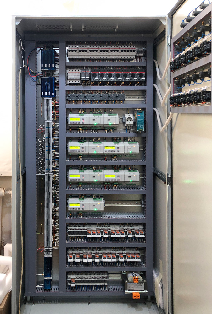 В рамках проекта необходимо было создать два взаимосвязанных шкафа управления: первый – для контроля системы приточной вентиляции с жидкостным обогревом, включающей несколько установок с циркуляционными насосами, и второй – для управления двенадцатью вытяжными установками.