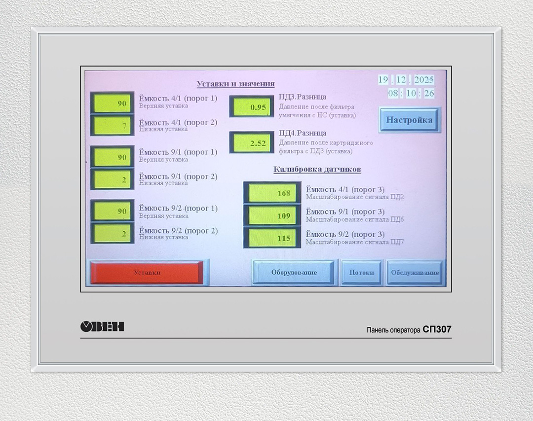 ПР102 обеспечивает логику управления агрегатами водоподготовки и насосной станции, обработку сигналов датчиков и исполнительных механизмов, модуль дискретного ввода МВ110-16Д – сбор данных с датчиков и оборудования системы, СП307-Б – визуализацию параметров, состояния узлов и сервисные функции для эксплуатации.