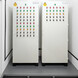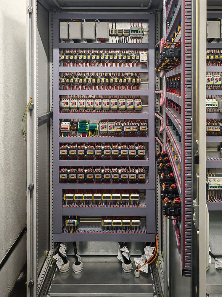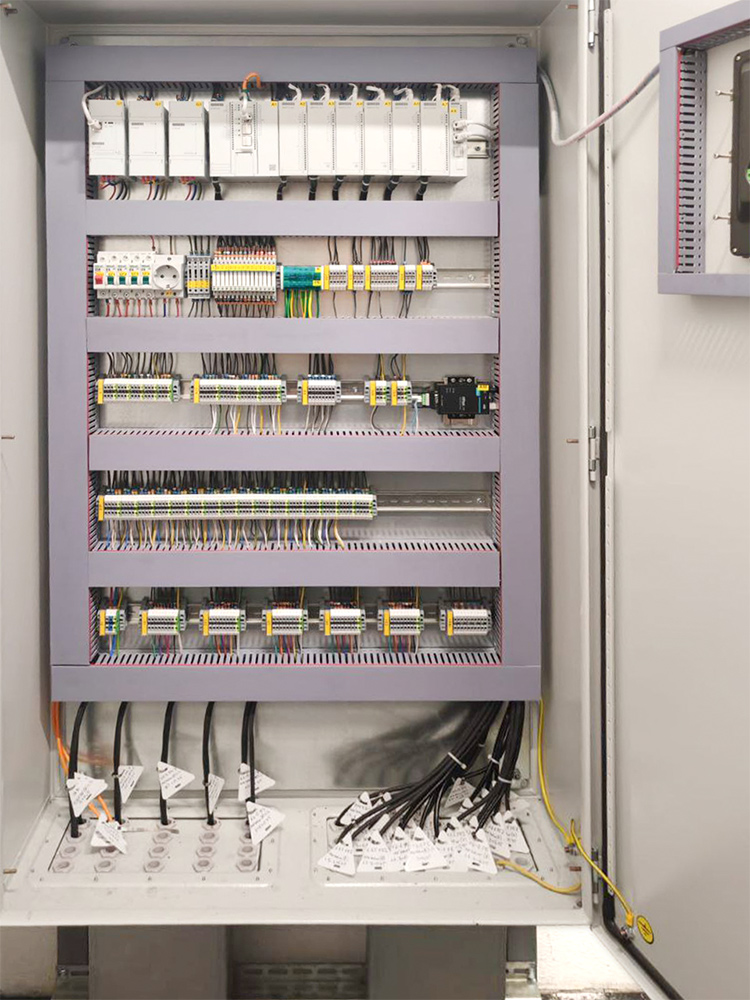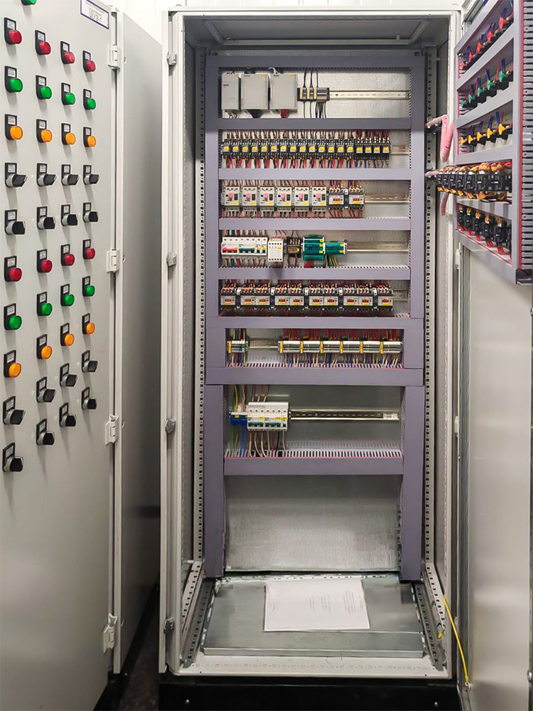 Основной шкаф управления содержит программируемый контроллер с расширенными сетевыми возможностями ОВЕН ПЛК210-01-CS, 8 модулей расширения аналогового ввода ОВЕН МВ210-101 для измерения аналоговых сигналов, преобразования измеренных величин в значения физических величин, 20 модулей расширения дискретного ввода ОВЕН МВ210-204 для сбора данных, 6 модулей аналогового вывода ОВЕН МУ210-502 для преобразования цифровых сигналов и управления исполнительными механизмами.