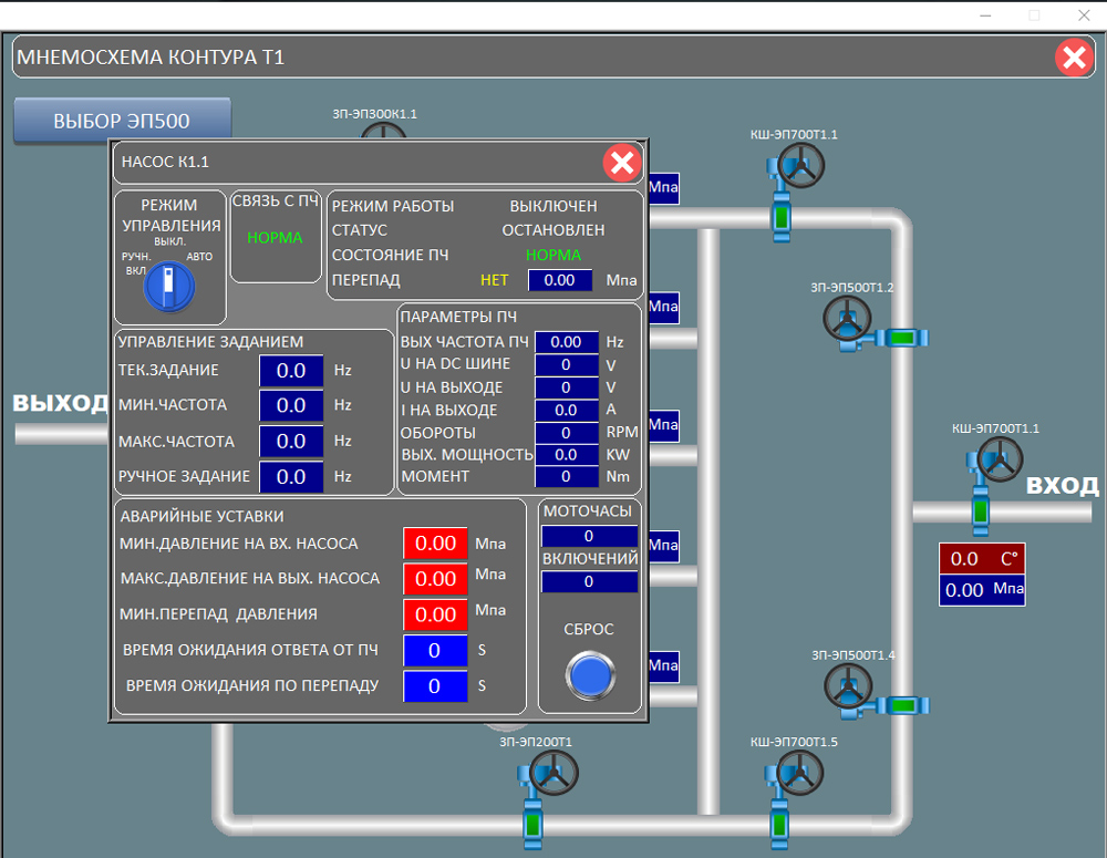 • аварийную сигнализацию при выходе из строя насосов или задвижек;