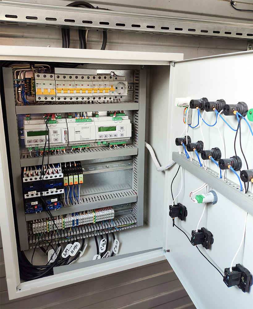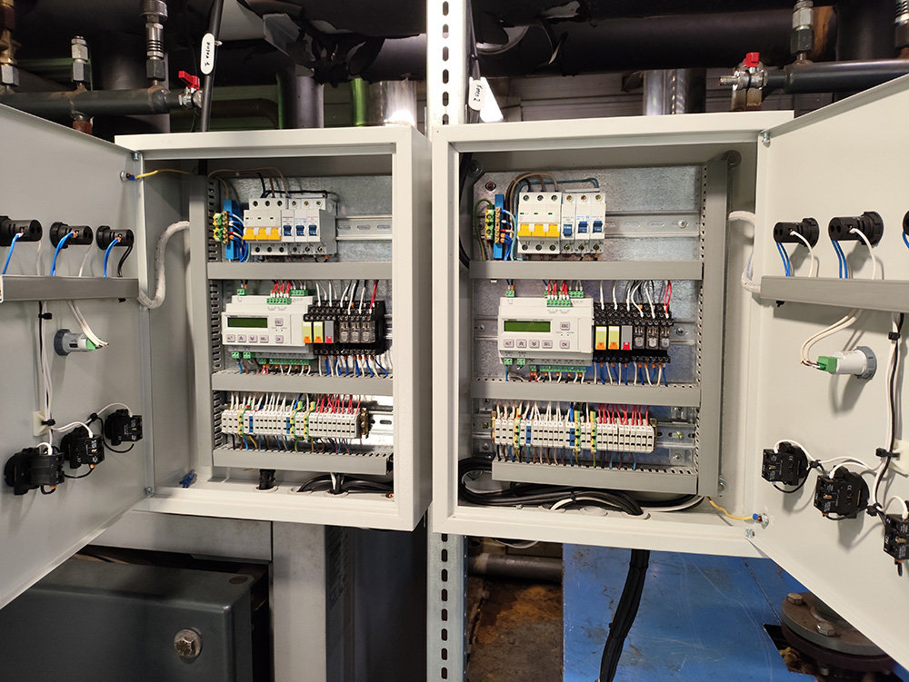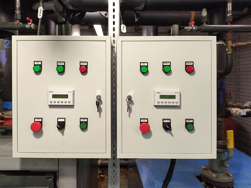 Для контроля и управления работой каждого котла были разработаны два шкафа управления, в каждом из них установили котловой регулятор ОВЕН КТР 121.01.10, управляющий насосами котла и горелкой, а также контролирующий температуру обратной воды и состояние котла.