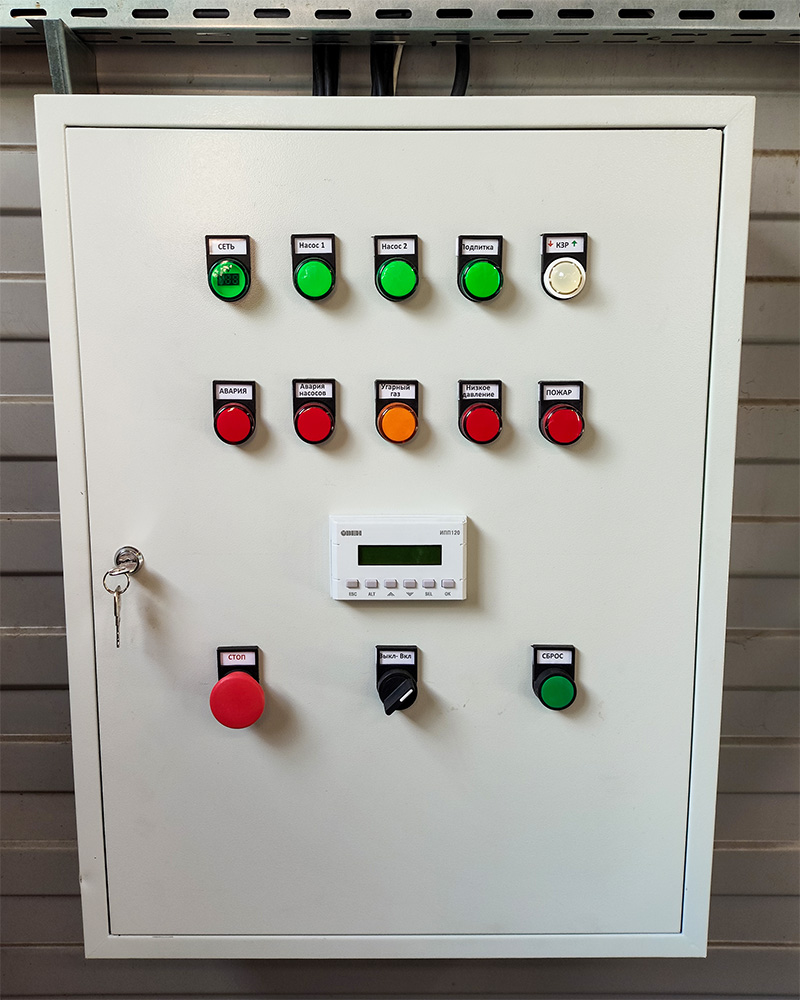 Для визуализации параметров на передней панели каждого шкафа установлена информационная панель оператора ОВЕН ИПП120 и светотехническое оборудование: лампы, кнопки, переключатели.