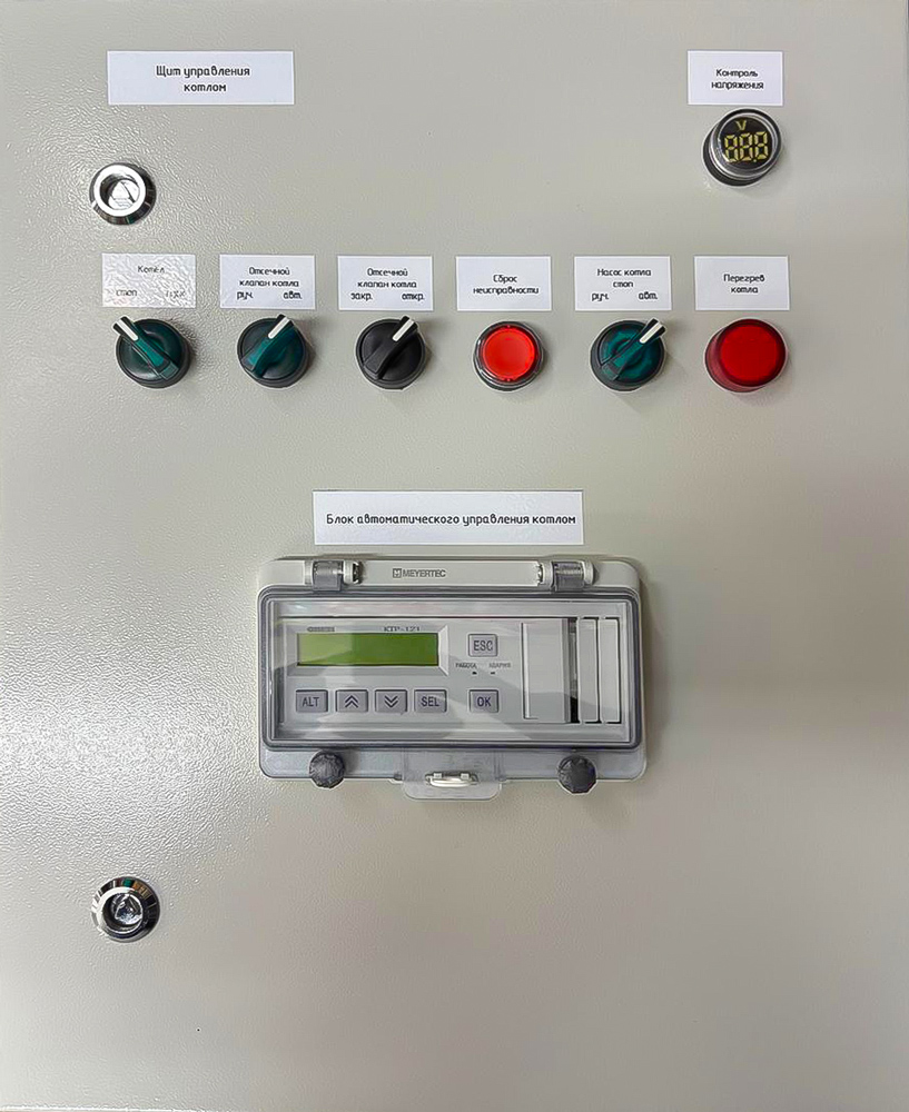 Для реконструкции объекта был разработан и изготовлен щит управления, обеспечивающий электроснабжение, ручное и автоматическое управление оборудованием, входящим в состав котла: