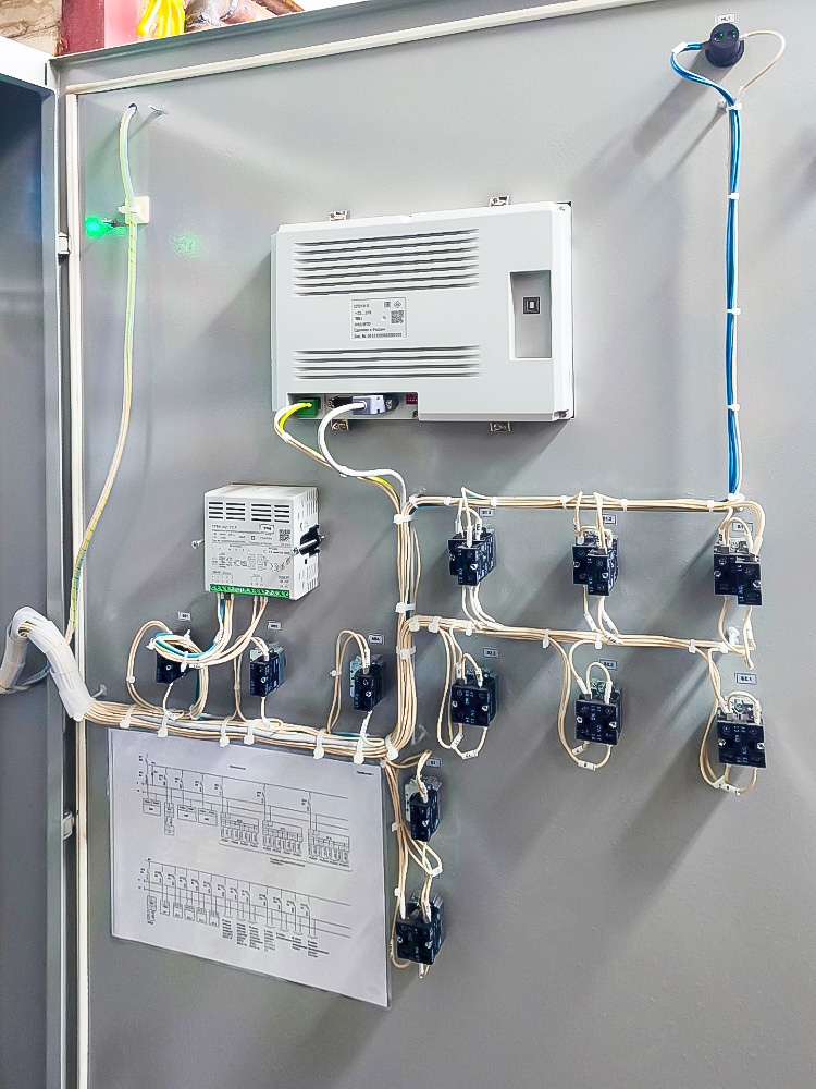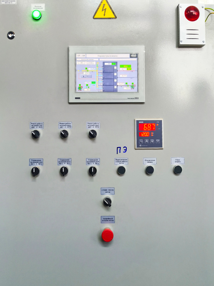 Система автоматического управления и защиты котла была разработана на базе программируемого логического контроллера ОВЕН ПЛК110-220.60Р-М с применением модулей ввода ОВЕН МВ110 и панели оператора ОВЕН СП307. Панель оператора вынесена на дверцу шкафа и обеспечивает полную визуализацию работы системы и управление. Промышленный одноканальный измеритель-регулятор с RS-485 в щитовом исполнении ОВЕН ТРМ1 предназначен для защиты котла от аварийно максимальной температуры воды на выходе из котла (дублирует защиту от датчика температуры подключенного к ПЛК) с принудительным (схемным) отключением клапанов газа.