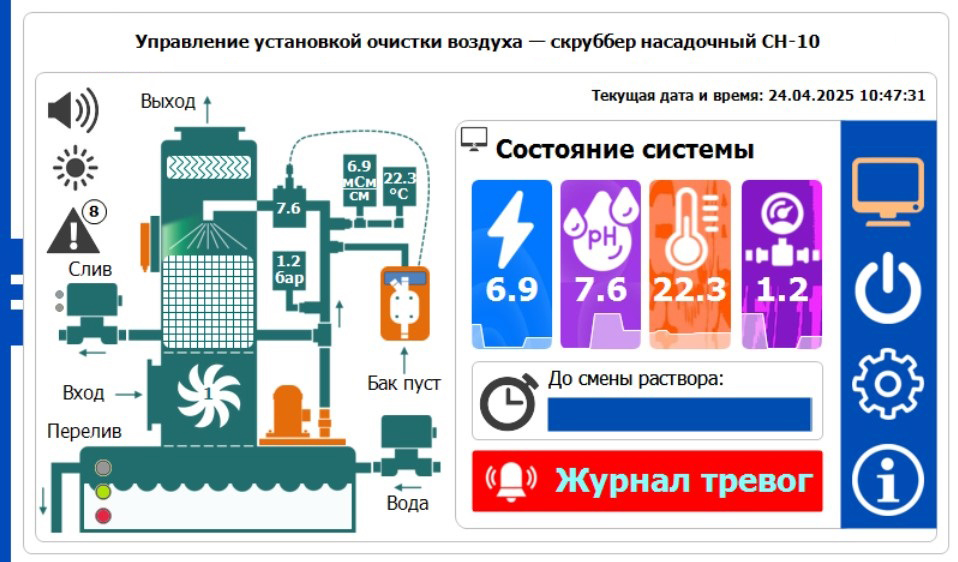 • непрерывный контроль и регулирование технологических параметров абсорбента (pH, электропроводности, температуры и давления), в том числе удаленно;