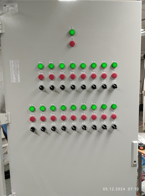 Для управления четырнадцатью секциями нагрева используется восьмиканальный регулятор ОВЕН ТРМ138 с двухпозиционным управлением и интерфейсом RS-485. Каждый канал регулятора контролирует обогрев шкафа в двух режимах, имеется доступ к параметрам регулирования через RS-485. Также предусмотрены ручное дублирование управления с двери шкафа для каждого контура регулирования и барьеры искрозащиты. Система оснащена мониторингом питания на вводе и светозвуковой сигнализацией для оповещения о любых авариях на линии или пропадании питания.